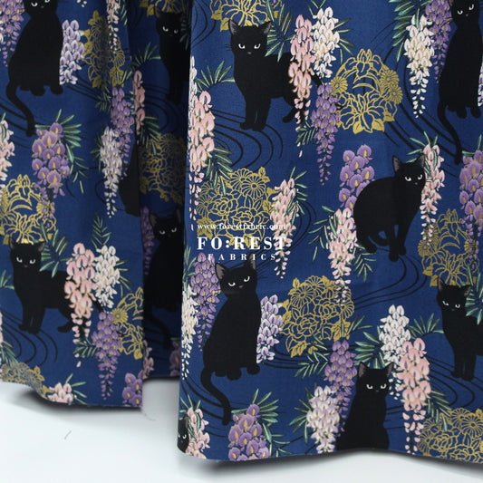 cotton - Wisteria flower cat S size fabric Navy