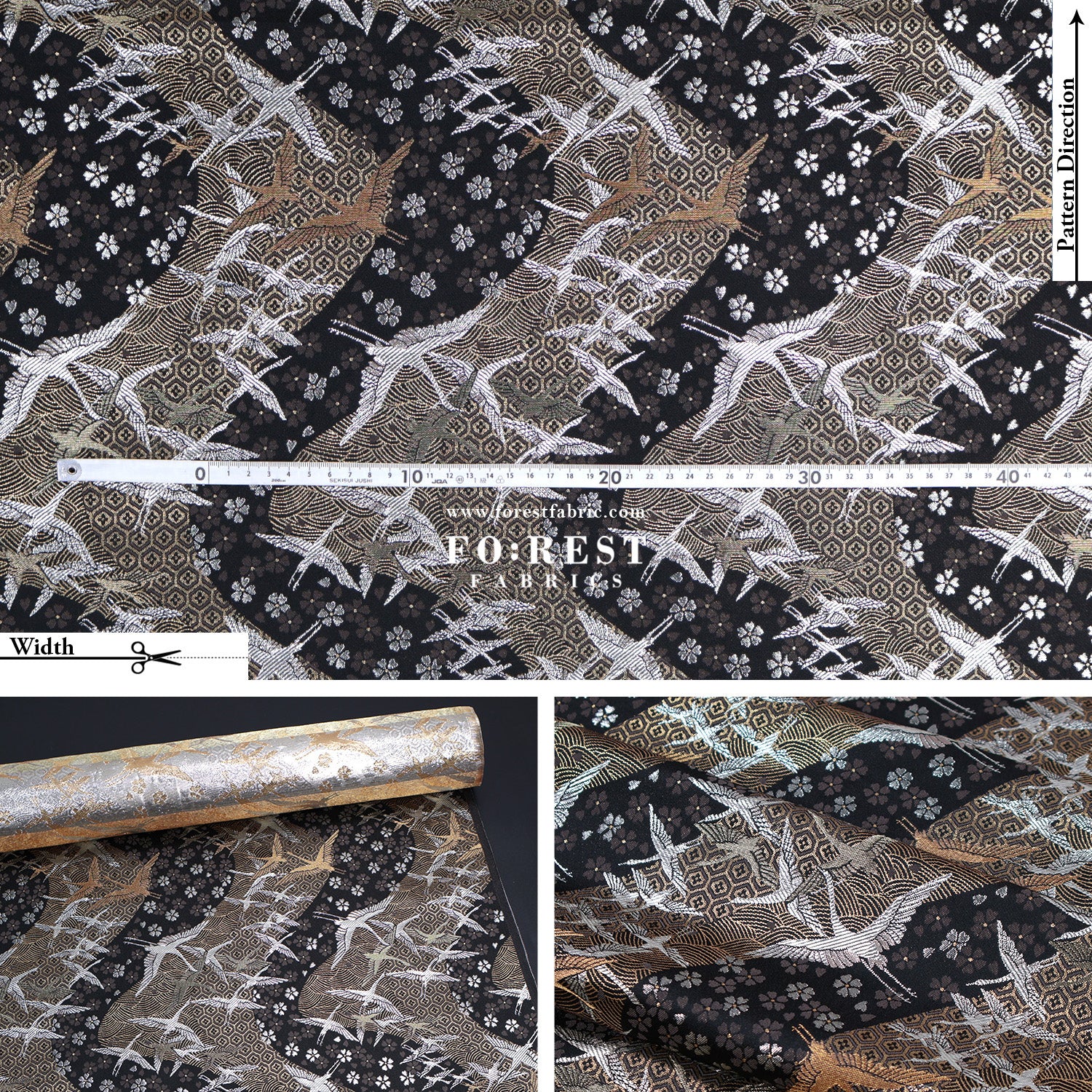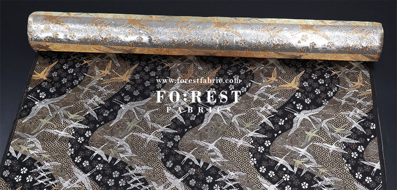 Gold Brocade - One thousand cranes fabric Black